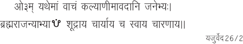 The Lord Says: I declare this speech of the four Vedas, for all the people, irrespective of their gender or status in their society, so as to do good to them in this world and after.