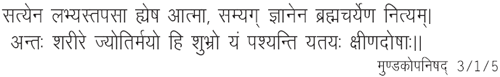 By truthfulness, austerity, right knowledge and Brahmacharya (Self control and purity) can that God be attained. He whom the sinless ascetics behold is pure and is like a light within the body.