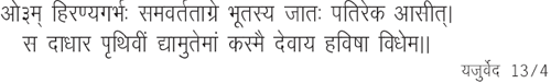 We should, with fervent devotion, adore him who is blissful and holy, the well known self-illuminated, creator of the earth and all luminous bodies like the sun, and the master of the universe who existed before creation.