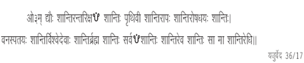 O Lord of peace! May there be peace in heaven, in sky and on earth. May the waters, medicinal herbs and all other vegetation be peaceful to us. May all the learned and enlightened bestow peace upon us. May the Vedas and the entire universe be suitable and peace-giving to us. May that all embracing peace remain eternally with us.