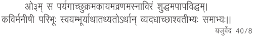 He (God) is all pervading, supreme spirit. He is bodyless, He can have no wounds. He is sinew-less, pure, and free from sins. He is all-knowing. He witnesses every thing. He is present everywhere. He is self-existent. He revealed the right knowledge of things through the Vedas, the eternal source of knowledge, to his eternal children, the souls.